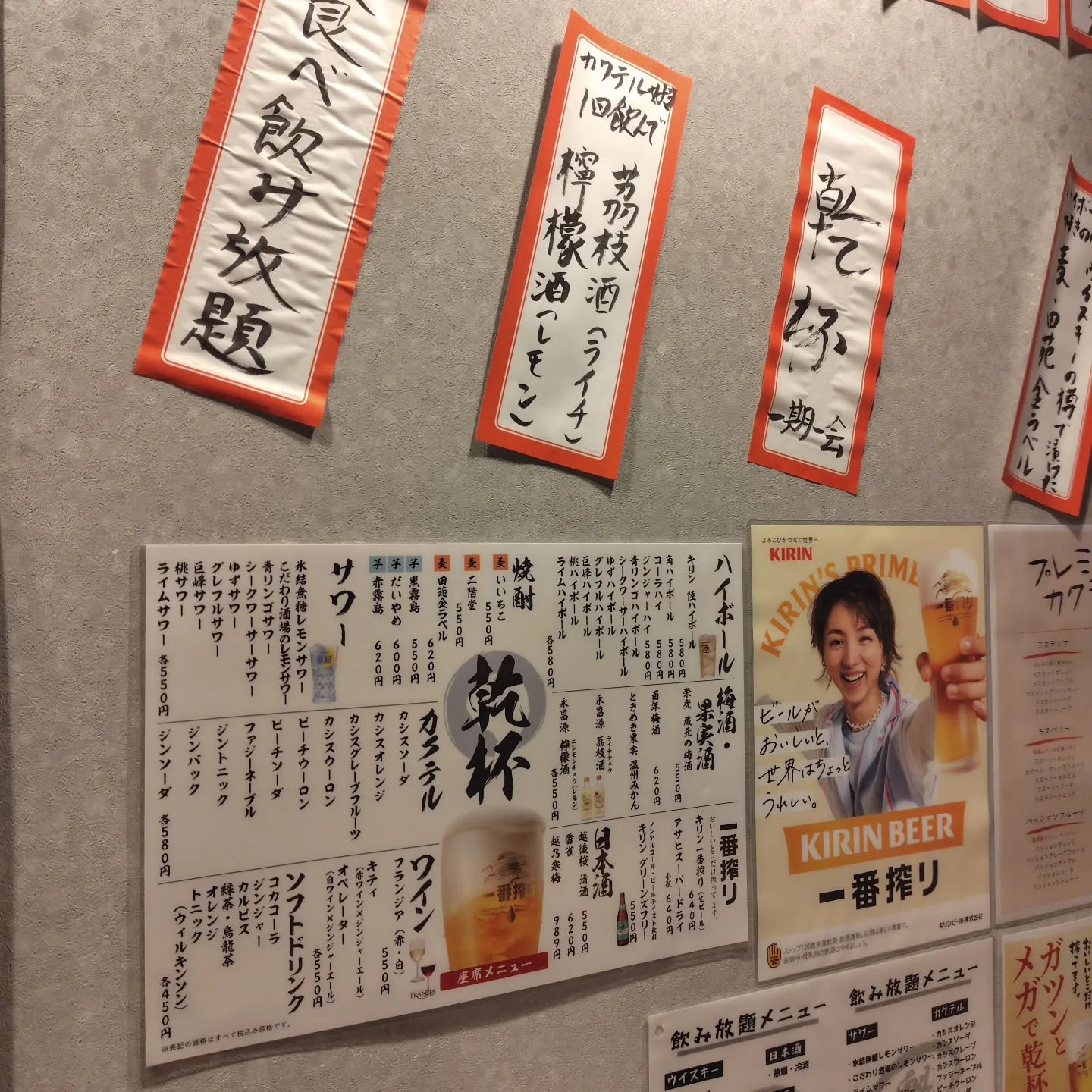 例えば、サワーは氷結無糖レモンや青リンゴ、シークワーサーなど各種550円、ハイボールはキリン陸や角ハイボールなど各種580円。